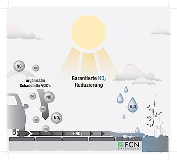 Die Photokatalyse ist ein Prozess, bei dem ein als Katalysator wirkender Stoff, genannt Photokatalysator, die Geschwindigkeit einer chemischen Reaktion, in diesem Falle der Oxidation von hochgiftigen Stickoxiden, stark beschleunigt. Bei der Photokatalyse wird die dazu erforderliche Energie alleine durch ultraviolette Strahlung bzw. Sonnenlicht geliefert. Stickoxide selbst sind nur schwer wasserlöslich und werden als giftiges Gas nicht aus der Atmosphäre ausgewaschen. Als Reaktionsprodukt der Oxidation von Stickoxiden durch Photokatalyse entsteht das wasserlösliche Nitrat. Dieses wird vom Regenwasser gelöst und so abgeführt. Im natürlichen Stoffkreislauf steht es den Pflanzen als essentieller Nährstoff zur Verfügung.