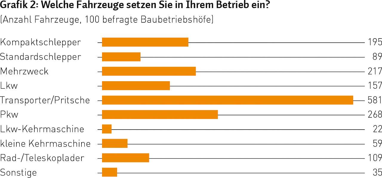 Unsere erste Frage an die Betriebsleiter bezog sich somit auf die Frage, welche Fahrzeuge vorhanden sind und wie intensiv sie genutzt werden. Die wichtigsten Fahrzeugkategorien zeigt Grafik 2. Was die Nutzung nach Jahren betrifft, also die Zeit, bis ein Fahrzeug durch ein neues ersetzt wird, liegen die Durchschnittswerte über alle Fahrzeuggruppen relativ einheitlich zwischen 13 und 15 Jahren. Allein die kompakten Kehrmaschinen verlassen nach gut elf Jahren die Betriebe. Natürlich gibt es in Sachen Alter auch Ausreißer, angefangen bei Leasingfahrzeugen, die nach vier Jahren getauscht werden, und nicht endend bei Fahrzeugen, die sogar das „Silberjubiläum“ feiern…
