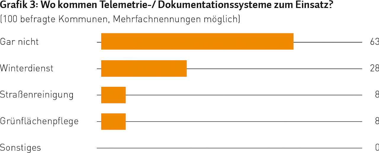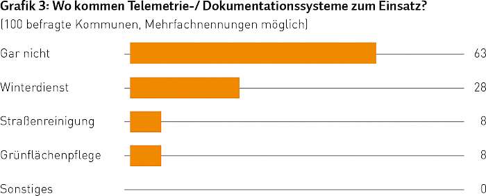 Unsere nächste Frage widmete sich einer Technik, die zwar wachsende Tendenz aufweist, aber ebenfalls noch nicht flächendeckend präsent ist: den Telemetrie- beziehungsweise Dokumentationssystemen. Grafik 3 zeigt Art und Einsatzintensität in den 100 Baubetriebshöfen. Spannend ist der Vergleich mit dem KT Trend-Report „Winterdienst“ (Ausgabe KT 6-2014): Damals gaben 12 % an, derartige GPS-gestützte Systeme zu nutzen.