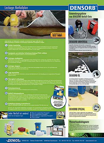 Wo gehobelt wird, fallen Späne. Nicht nur in der Tischlerei. Auch im industriellen Umfeld geht mal was daneben. Zum Beispiel als Tropfverlust von Hydrauliköl an Maschinen. Dann beeinträchtigt Rutschgefahr die Betriebssicherheit. Noch schlimmer sieht es aus, wenn sich nach einer Leckage gefährliche Flüssigkeiten unkontrolliert "dünne machen". Dann heißt es, die Ruhe zu bewahren und schnell und überlegt die richtigen Schritte einzuleiten. Dabei hilft jetzt ein neuer Leckage-Notfallplan aus dem Hause Denios. Dort beschäftigt man sich professionell mit Fragen der betrieblichen Sicherheit und des Umweltschutzes in Unternehmen.Denn weil jedes Unternehmen anders aussieht, hat auch jede Havarie ihr eigenes Gesicht. Der Leckage-Notfallplan zeigt Schritt für Schritt, wie Betroffene im Schadensfall richtig reagieren und einen eigenen Notfallplan aufstellen, der sich an den Bedürfnissen des jeweiligen Unternehmens orientiert. Der Notfallplan ist als übersichtliches Poster im Format 70 x 50 cm gestaltet und kann überall dort aufgehängt werden, wo in Produktion und Betrieb im Umgang mit gefährlichen Flüssigkeiten ein Leckagefall droht. Der kostenlose Leckage-Notfallplan kann sowohl telefonisch (0800 753-0002) als auch im Internet unter www.denios.de angefordert werden.