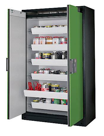Im Bereich der Sicherheitsschränke für die Gefahrstofflagerung hat Denios eine neue Serie auf den Markt gebracht. Auffällig ist bei diesem die optische Gestaltung mit durchgehend dunklem Körper und sieben verschiedenen Farbvarianten für die Türen. Diese bleiben nach Herstellerangaben ohne zusätzliche Türfest-stellanlage in jedem Öffnungswinkel stehen. Eine Rot-Grün-Anzeige signalisiere den aktuellen Schließzustand der Türen. Im Brandfall sollen technische Elemente wie Schmelzlote für die sichere Türschließung sorgen. Der Gefahrstoffschrank verfüge über 90 Minuten Feuerwiderstandsfähigkeit nach EN 14470-1 (Typ 90): typgeprüft, GS-geprüft, mit CE-Konformität. Die neue Schrankserie ist in 60, 90 und 120 cm Breite verfügbar und sei sehr robust. Die Einbringung und der Transport sollen durch eine verbesserte Verwindungssteifheit vereinfacht sein. Ein integrierte Sockel sowie eine mobile Transporthilfe unterstütze dies. Ein laut Denios manipulationssicheres Türschloss ist in jeder Schranktür verbaut, so dass die Entnahme der gefährlichen Stoffe nur von entsprechend befugten Personen erfolgen kann.