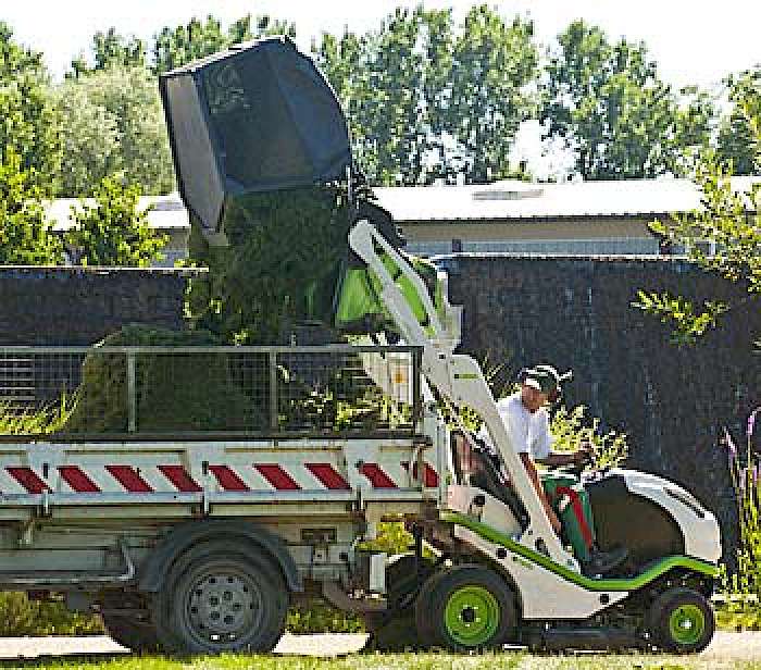 Unterschiedliche EntleerungModell HVSP, Bodenentleerung: Die hydraulische Entleerung des Grasfangkorbes erfolgt vom Fahrersitz aus.Modell HVHP, Hochentleerung: Die hydraulische Anhebung des Korbes, die bei diesem Modell serienmäßig ist, sowie die Korbleerung erfolgen durch Bedienen eines Hydraulikverteilers vom Fahrersitz aus. Die Entleerung kann laut Hersteller in allen Positionen am Boden und bis zu 1,83 Meter Höhe durchgeführt werden.