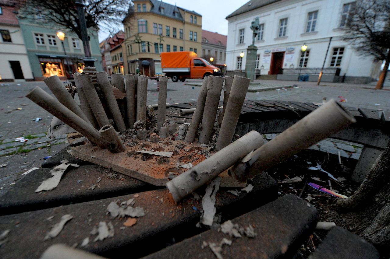 Die Silvesternacht hat wie immer Spuren hinterlassen. 14 Kollegen haben am Neujahrsmorgen knapp 3 m³, also 20 Badewannen voll Müll in der Innenstadt zusammengekehrt. Überrascht hat uns die Menge nicht, es wurde nicht mehr und nicht weniger geknallt als in den Jahren zuvor.
