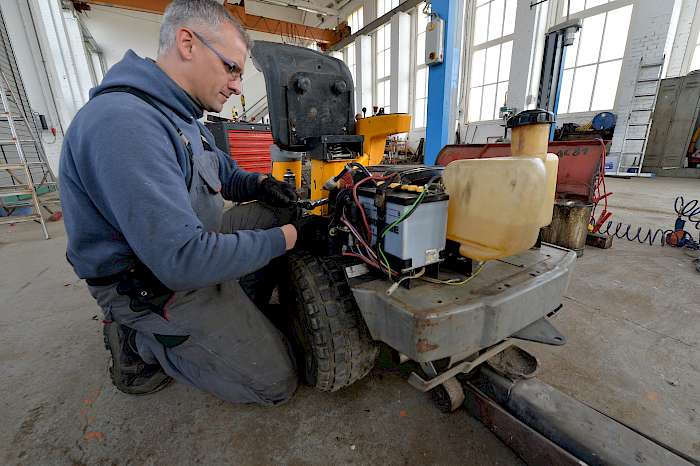 Alle Geräte, die wir im Sommer im Einsatz haben, werden über den Winter in unserer Werkstatt gereinigt, gewartet – und wenn nötig repariert. Wir haben rund 200 motorbetriebene Geräte, da fällt immer was an. Unsere Werkstatt ist das Revier von Maik Nielebock und Uli Klempke. Beide arbeiten seit vielen Jahren für uns. Und auch, wenn sie ihre Arbeit im Hintergrund verrichten, sind sie doch ein wichtiges Zahnrad im Getriebe. Sie sorgen dafür, dass wir immer einsatzbereit sind. Und streikt doch mal ein Gerät, sind sie sofort zur Stelle. Für Vor-Ort-Reparaturen steht ihnen ein komplett ausgestatteter Werkstattwagen zur Verfügung.