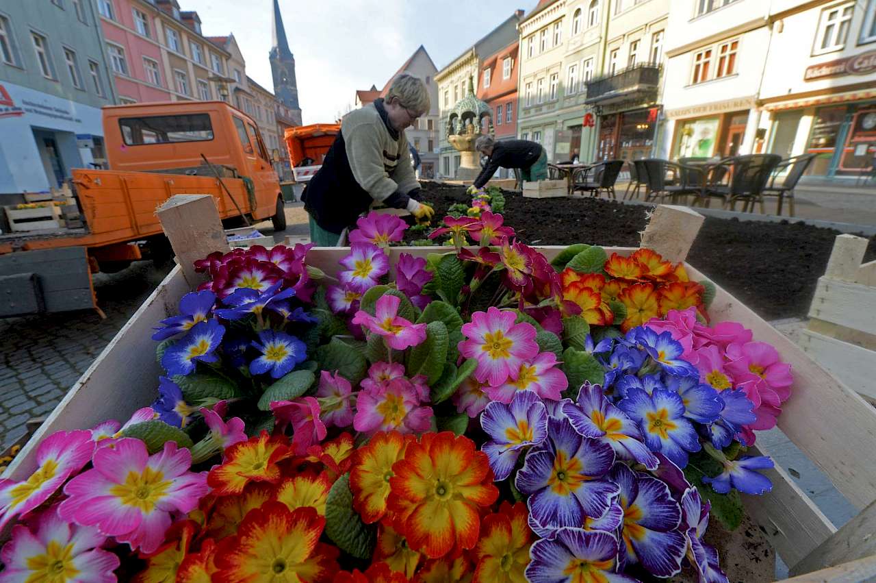 Aschersleben ist wieder bunt. In den vergangenen Wochen haben unsere Mitarbeiter 32 000 Frühjahrsblüher in die Erde gebracht - jede Menge Hornveilchen, aber auch Stiefmütterchen, Primeln und Vergissmeinnicht. Die Pflanzen beziehen wir grundsätzlich von Gärtnereien aus der Region. Es ist ein kleiner Beitrag zur Wirtschaftsförderung. Die Ausschreibung für die Frühjahrsbepflanzung hat die Gärtnerei Eckleben aus Frose gewonnen, die für die Sommerbepflanzung die Firma Tinplant aus Klein-Wanzleben. Dass die Stadt grünt und blüht, ist aber auch zahlreichen Sponsoren zu verdanken. Seit vier Jahren haben Geschäftsleute und Vereine, aber auch Privatpersonen die Möglichkeit, das „Grün“ in großen Blumenkübeln gegen eine Spende direkt vor ihre Haustür zu holen. So werden die Kosten für das Aufstellen der Pflanzmodule und das Befüllen mit zertifiziertem Kompost und Pflanzmaterial für Frühjahr und Sommer gedeckt. Die zwölf bis 15 Pflegedurchgänge und Bewässerung finanziert die Stadt.