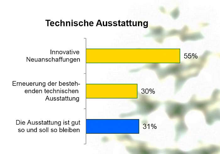 Jeder zweite Befragte (55 %) wünscht sich innovative Neuanschaffungen im Betrieb – ein guter Wert angesichts z.B. der noch geringen Verbreitung von Elektrofahrzeugen – hier könnte die Kommunalwirtschaft Vorreiter und Wegbereiter sein. 30 % der Befragten hoffen außerdem auf eine Erneuerung der bestehenden Ausstattung. Das könnte ein Indiz dafür sein, dass diese nicht flächendeckend up to date ist. Keinen Handlungsbedarf sehen 31 % der Befragten; sie sind mit der Ausstattung zufrieden und der Meinung, dass diese sich nicht ändern muss.