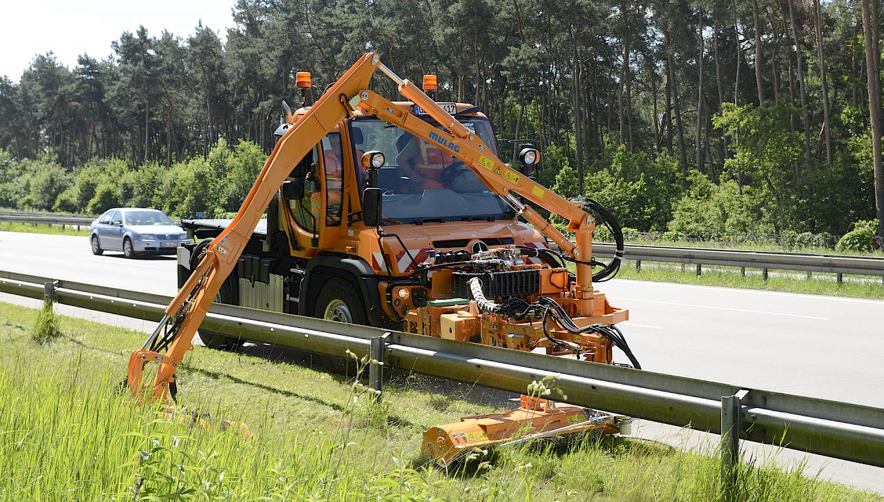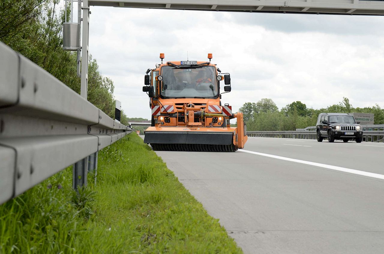 Die zweite Testphase des Unimog U 423 erfolgte von Mitte Mai bis Mitte Juni bei der Autobahnmeisterei Erkner, ca. 15 km östlich von Berlin. Hier wurde der Unimog zur Reinigung des Standstreifens mit einer Dücker Frontkehrbürste SFK 2700 sowie dem Kombinationsmähgerät Mulag MKM 700 mit integriertem Randstreifenmähgerät MRK 300 zum Schnitt des Straßenbegleitgrüns eingesetzt. Zum Glück hat das Frühjahr für den Test mitgespielt: Der Aufwuchs war aufgrund des feuchten und warmen Frühjahrs üppig. So wurde der Unimog zumindest im zweiten Testzeitraum beinahe täglich gefordert und es kamen weitere 80 Einsatzstunden hinzu...