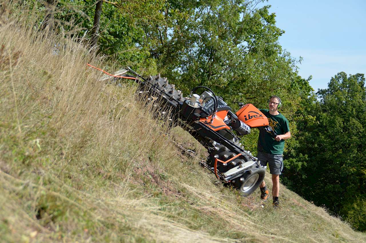 TerraTec ist ein vergleichsweise junges Unternehmen, gegründet im Jahr 2013 vom Konstrukteur Lukas Schrottenbaum. Entwickelt und produziert werden die Geräte in Schruns im Montafon. Also mitten in den Bergen. Und dort sind sie eigentlich auch zu Hause. Vor allem in Deutschland, Österreich und der Schweiz werden in der Landwirtschaft nicht unerhebliche Stückzahlen abgesetzt. Dabei ist der Markt von Anbieterseite recht überschaubar, das grundsätzliche Konstruktionsprinzip bewährt. Aber Lukas Schrottenbaum ist es gelungen, sich mit dem Ibex deutlich vom Wettbewerb abzuheben. Zum einen setzt er voll auf eine verschiebbare Achse. Diese hat große Vorteile, wenn mit unterschiedlichen Anbaugeräten gearbeitet wird. Denn egal, ob mit einem leichten Doppelmesserbalken-Mähwerk oder mit einem schweren Mulcher, der Schwerpunkt des Ibex kann immer so angepasst werden, dass das Gerät einfach manövriert und mit wenig Druck auf den Holm auch über Hindernisse, wie Steine oder Baumstümpfe gehoben werden kann. Außerdem kann durch so das berüchtigte „Männchen-machen“ bei Bergauffahrt in extrem steilem Gelände verhindert werden. Das Ganze geschieht per Knopfdruck mit dem linken Daumen auch während der Fahrt, der Verstellweg beträgt 350 mm. Von ganz hinten nach ganz vorne dauert das Verfahren rund 7 sec.