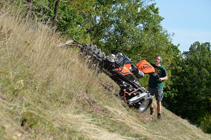 Besonders gut gefallen hat uns das Bedienkonzept. Gestartet wird der Motor elektrisch. Mit der rechten Hand wird über einen Drehhebel gelenkt. Die Fahrgeschwindigkeit wird über ein Daumenrad geregelt. An der Unterseite befindet sich ein Taster der gedrückt werden muss, damit die Maschine rückwärtsfährt. Wird er zweimal kurz gedrückt, fährt der Einachser wieder vorwärts. Und zwar mit der vorher eingestellten Geschwindigkeit. Wird der Totmannschalter am Griff losgelassen, steht die Maschine sofort, der Antrieb für die Anbaugeräte wird automatisch ausgeschaltet. Dabei schwenkt die Pumpe in ihre Neutralposition, was bewirkt, dass die Räder blockiert sind. Im Steilhang kann das vor schweren Unfällen bewahren. Muss der Mäher doch einmal geborgen werden, kann die Bremse manuell gelöst werden.