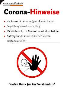 Spätestens seit der zum zweiten Mal deutschlandweit verhängten Kontaktsperre sollten es zwar alle verstanden haben, im Eifer des Gefechts vergisst der eine oder andere aber vielleicht immer noch die zurzeit geltenden Verhaltensregeln. Ein Corona-Hinweis an der Kabinentür von kommunalen Fahrzeugen kann helfen, Ihre Mitarbeiter zu schützen.