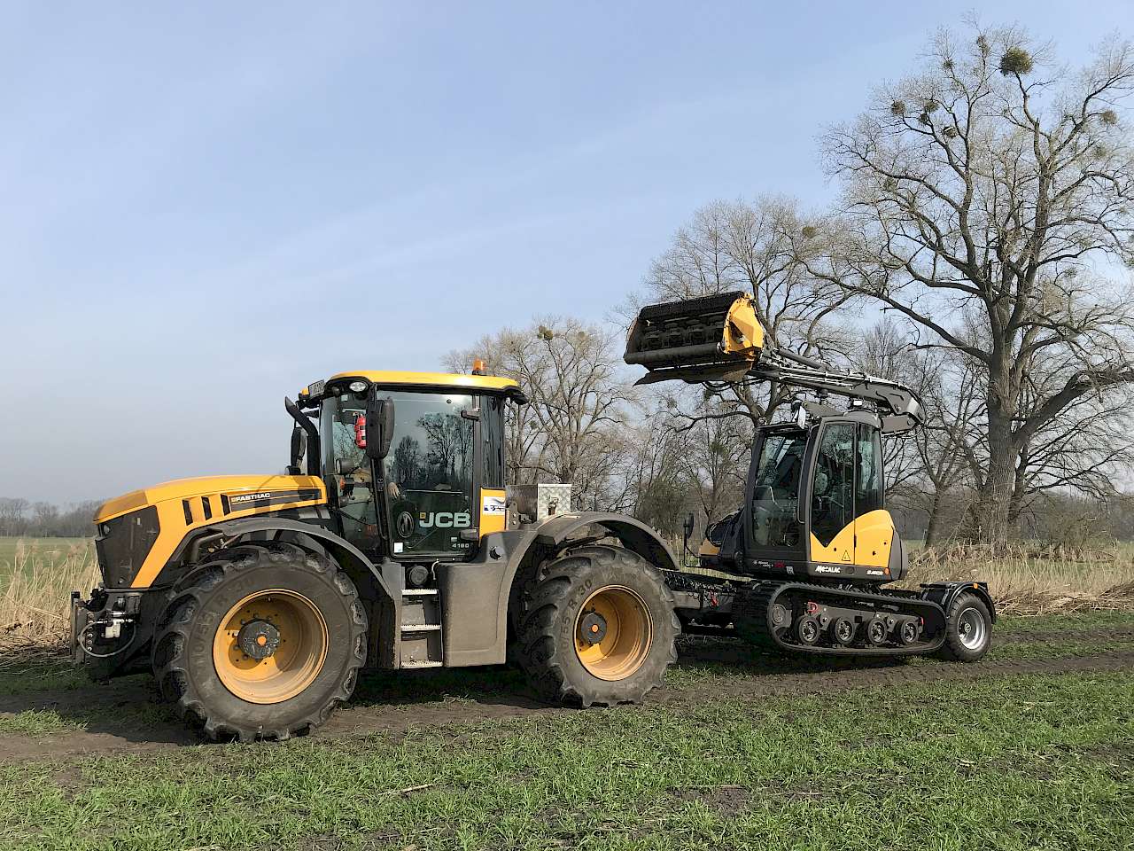 Der 7,5-t-Kettenbagger von Mecalac ist als Graben- oder Böschungsmähmaschine inklusive 4,3 m breitem Mähkorb konfiguriert. Durch das fest angebaute Straßen-Transportsystem kann der Bagger an einen Schlepper angehängt auf der Straße gefahren werden. Die beim Tieflader übliche Ladungssicherung entfällt. Das Gerät verfügt über eine TÜV-Zulassung.