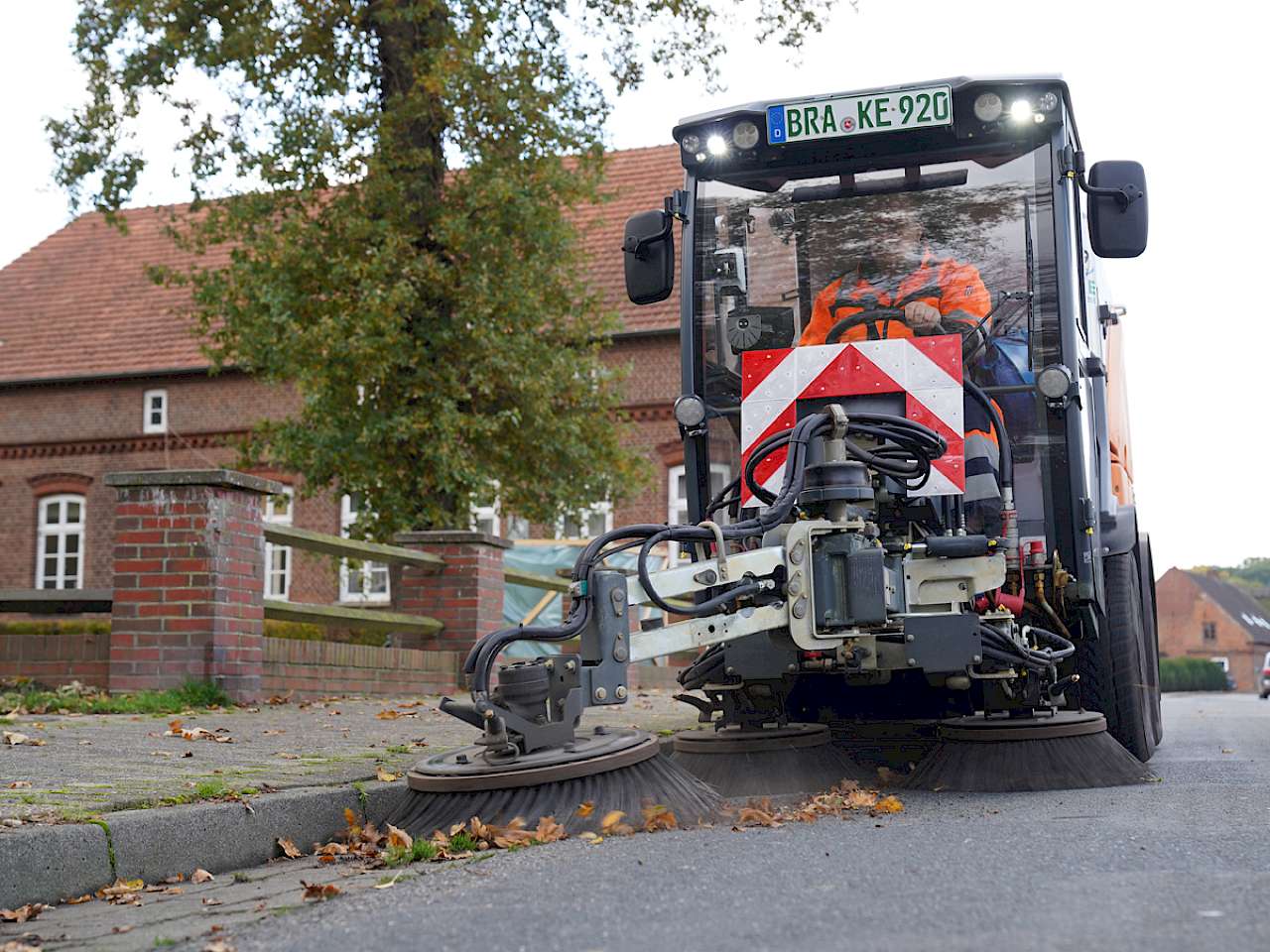 Ein weiterer zentraler Vorteil der 3,5-Tonner: Die Maschinen dürfen mit der Euro-Führerscheinklasse B gefahren werden. Dadurch ist es für die Betreiber deutlich einfacher, Mitarbeitende mit der entsprechenden Fahrlizenz zu finden. Die Kehrseite der Führerscheinfreundlichkeit sind allerdings geringere Nutzlasten und damit entsprechend kurze Einsatzzeiten bis zum Entladen. Gerade im Herbst, wenn feuchtes und entsprechend schweres Laub aufgenommen werden muss, kann das ein Nachteil sein.