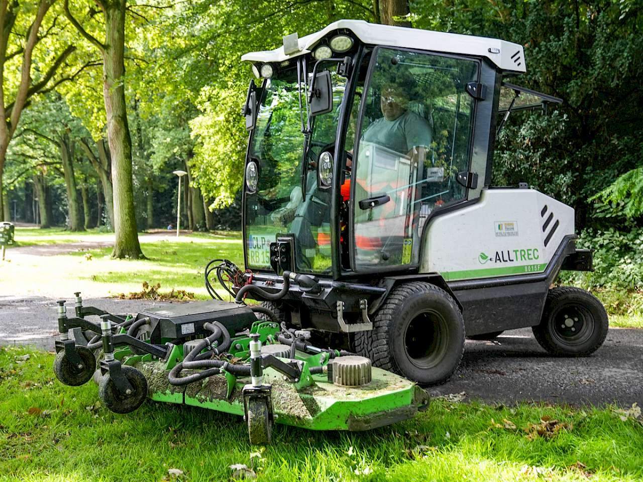 Der Geräteträger selbst, ein AllTrec 8015F des niederländischen Herstellers FPS-Electric B.V, verfügt über einen Elektroantrieb für alle Fahr- und Mähfunktionen. René Lohaus macht sich an die Arbeit. Die zahlreichen Rasenflächen in seinem Bezirk müssen jetzt in der Wachstumsperiode im 3-Wochen-Rhythmus gemäht werden.