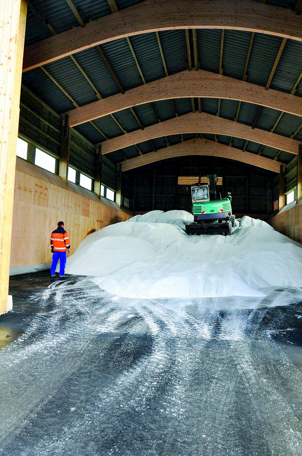 Bei Streustoffhallen sollte differenziert werden nach der Lagerfläche, die aus der erforderlichen Lagerkapazität resultiert, sowie nach einer ausreichend dimensionierten Betriebsfläche. Diese Fläche ist für das Rangieren des Radladers, den witterungsgeschützten Standort einer Salzlöseanlage oder die Standentleerung von Winterdienstfahrzeugen vorzusehen. Weiterhin ist nach Möglichkeit darauf zu achten, dass die Winterdienstfahrzeuge zum Beladen die Betriebsfläche befahren können, ohne rückwärts zu fahren. Neben dem Witterungsschutz bietet die Anordnung der Salzlöseanlage in der Halle den Vorteil der kürzeren Rangierfahrten für den Radlader.
