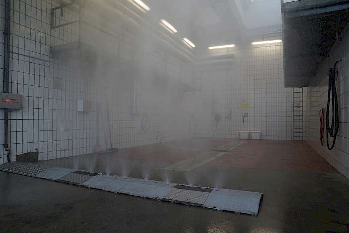 Dirk Gippert hat sich daher mit den Reinigungsspezialisten der Firma Meier-Brakenberg zusammengesetzt, um gemeinsam nach einer kostengünstigen Lösung zu suchen. Das Unternehmen aus dem westfälischen Extertal ist vor allem mit Reinigungs- und Desinfektionstechnik für tierhaltende Agrarbetriebe am Markt, die Reinigungsanlagen werden aber auch in anderen Branchen häufig genutzt. Die Zusammenarbeit trug schnell Früchte. Innerhalb weniger Wochen wurde eine Unterfluranlage realisiert. Sie besteht aus einer Überfahrschwelle mit integrierten Waschdüsen, die über eine Hochdruckpumpe mit Wasser versorgt werden.