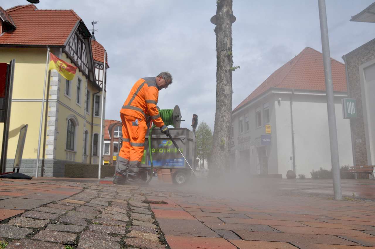 Vorab: die Innenstadt macht auf mich Anfang Mai einen sehr gepflegten Eindruck. Das mag daran liegen, dass der Frühling hier oben im Norden in diesem Jahr bisher kühl und wenig wüchsig ist, oder es wird von Seiten der Stadtverwaltung viel Wert auf ein ordentliches Erscheinungsbild gelegt. „Publikumswirksame Flächen, wie hier rund um das Rathaus und den Marktplatz oder auch Bushaltestellen, bearbeiten wir bis zu viermal pro Jahr mit dem Heißwassergerät. Ich kann aber feststellen, dass das Unkraut an einigen Stellen schon weniger wird. Dadurch, dass es nicht mehr zum Blühen kommt, gibt es kein neues Samenpotential und die Pflanzen werden auf Dauer ausgehungert“, berichtet Martin Schwermann. Er teilt sich diese Aufgabe mit einem Kollegen.