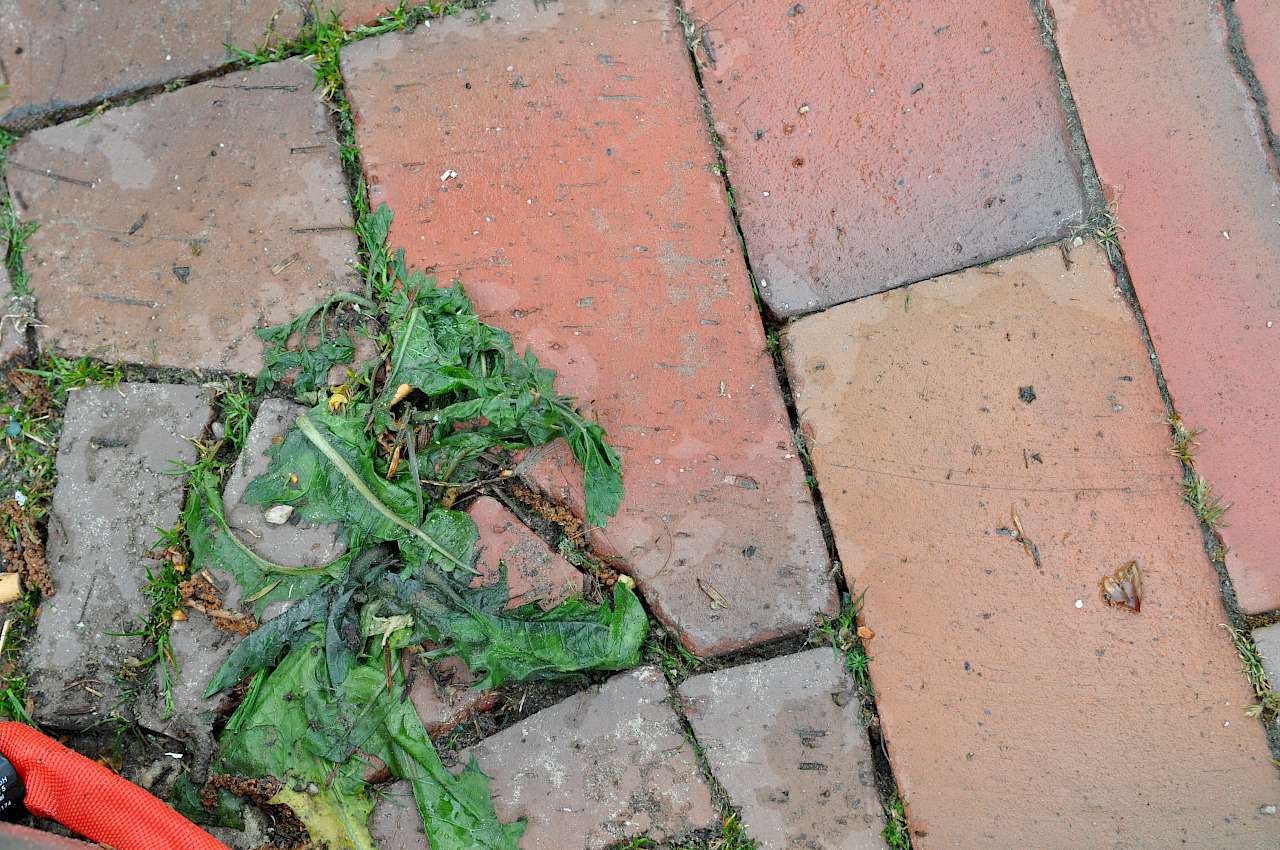 Der Stadiko Heißdampferzeuger Ökotherm arbeitet mit bis zu 130 °C heißem Wasser-/Wasserdampfgemisch, dem lediglich etwas Wasserenthärter zugefügt wird. Der Wasserdampf hat die Aufgabe, die Oberfläche anzuwärmen, damit das im gleichen Arbeitsgang ausgebrachte heiße Wasser ohne Temperaturverluste an die im Boden befindlichen Wurzeln gelangt. Durch diesen Vorgang wird in der Pflanze ein Eiweißschock ausgelöst, der die Zellwand der Pflanze nachhaltig zerstört. Die Pflanze soll nun kein Wasser mehr aufnehmen und vertrocknet. Der soeben behandelte Löwenzahn rund um ein Straßenschild erinnert etwas an gedünsteten Spinat, fällt aber nach ein bis zwei Tagen in sich zusammen und verrottet, so Martin Schwermann. Sehr gut bestockte Grasbestände seien am schwierigsten zu behandeln, denen müsse man öfter zu Leibe rücken oder auch mal händisch nachhelfen. „Da muss dann unter Umständen im Vorfeld nochmal ein Freischneider ran, so dass die Pflanze nicht mehr so viel Grün besitzt und das Heißwasser direkt an der Wurzel wirken kann“, ergänzt Helmut Schwarte. „100 °C heiß sollte das Wasser bei Benetzung sein, um eine gute Wirkung zu erzielen“, erklärt Mitarbeiter Martin Schwermann.