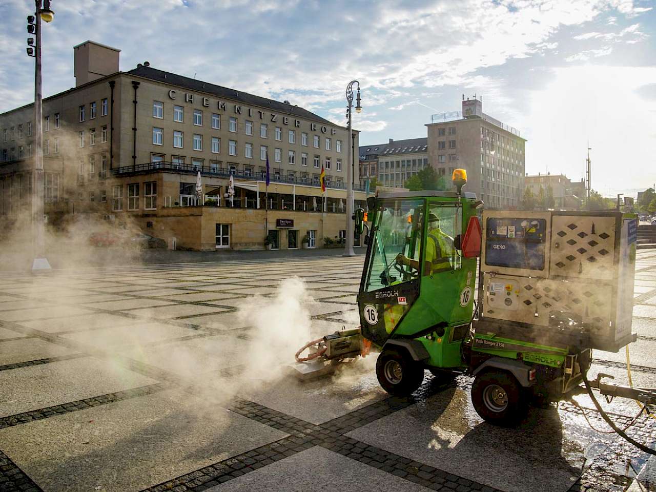 Hohe Flächenleistungen: Müssen große Flächen behandelt werden, bieten sich Heißwassergeräte an, die auf Geräteträgern oder Kommunaltraktoren montiert sind. (Foto: Keppler)