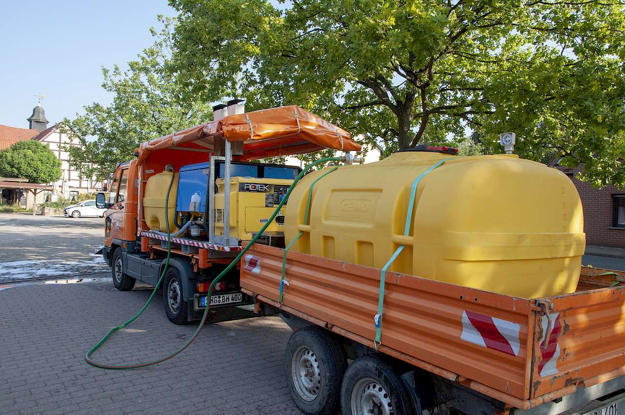 Rund 1.000 l Wasser führt das System in der Herstellervariante mit. Bei 18 l pro Minute sei der Tank nach rund einer Stunde leer. „Sehr unpraktisch, wenn man sich dann nicht in unmittelbarer Nähe des Baubetriebshofes befindet und das sind wir als Samtgemeinde-Bauhof selten“, sagt Ulrich Reumke. Gelöst wurde dieses Problem über einen 2.000 l fassenden Extra-Tank. Dieser ist ebenfalls auf einem verzinkten Rahmen untergebracht und durch eine eigene Pumpe ergänzt. Mitgeführt wird der gesonderte Tank hinter dem Trägerfahrzeug auf dem ebenfalls vorhandenen Multicar-Anhänger. Bei Bedarf wird mit Hilfe des Stromaggregates des Heißwasser-Schaum-Systems, das Wasser aus dem Extra-Tank nach vorne umgepumpt. Auch diese Lösung wurde von der Firma iProGreen für den Baubetriebshof Sachsenhagen umgesetzt.
