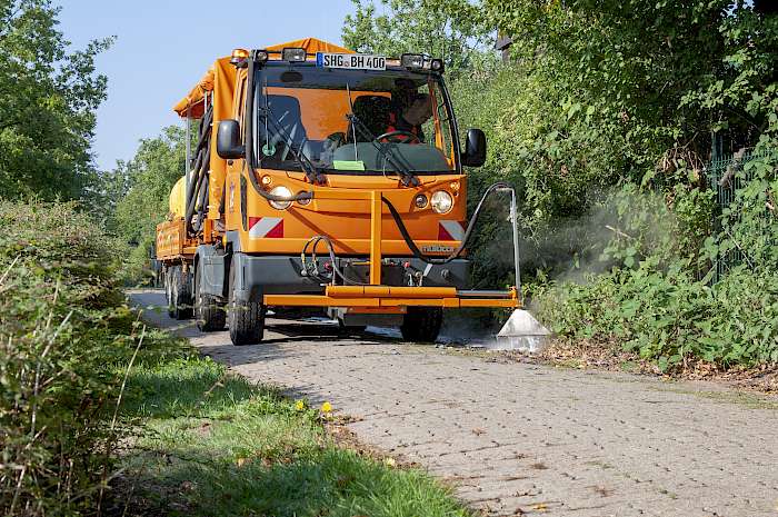 Weiterhin gefiel dem Bauhofleiter nicht, dass das ursprüngliche System nur über eine Handlanze einsetzbar war: „Das ist auf Plätzen und an einzelnen Stellen sicherlich sinnvoll, wir pflegen unter anderem aber auch eine alte, mehrere kilometerlange Bahntrasse, die als Fahrradweg genutzt wird. Niemand kann stundenlang oder gar tagelang so langsam vor sich hingehen. Deshalb haben wir uns auch die Möglichkeit einer ‚fahrenden‘ Lösung gewünscht.“ Gesagt, getan – in diesem Fall wurde der Sonderwunsch allerdings vom Betriebsschlosser des Bauhofes Tobias Bender umgesetzt: Dieser konstruierte und baute für den Vorbauträger des Multicars ein Gestell, in das bei Bedarf die Wildkraut-Lanze eingehängt wird. Mithilfe eines Hydraulik-Zylinders kann diese rein- und rausgeschwenkt werden. Über den Vorbauträger kann ebenfalls vom Fahrersitz aus die Höhe variiert werden. „So kann unser Mitarbeiter viele Strecken im Kriechgang fahrend die Wildkrautbeseitigung im Sitzen erledigen. Bei Bedarf nimmt er die Lanze heraus und bearbeitet einzelne Stellen mit der Hand“, ist Ulrich Reumke begeistert. Mit dieser Lösung stehen insgesamt 3000 l Wasser zur Verfügung, ohne nachtanken zu müssen.